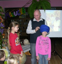 Położona w samym środku miasta biblioteka, do której dotarłem około wpół do dziewiątej rano okazała się przytulnym, pełnym światła miejscem, pachnącym książkami, herbatą i rogalikami z posypką kokosową. Ledwie zdążyłem rozstawić rekwizyty i sprzęty, w korytarzu rozległ się gwar dziecięcych przepychanek. Do salki wbiegły dzieci. Ciekawskie, żywe, rozszczebiotane. Jeden tylko chłopiec jakoś nie miał tego dnia humoru. Może to ten deszcz i wiatr go tak nastroił? Siadł z boku naburmuszony i splótł ręce na piersi.